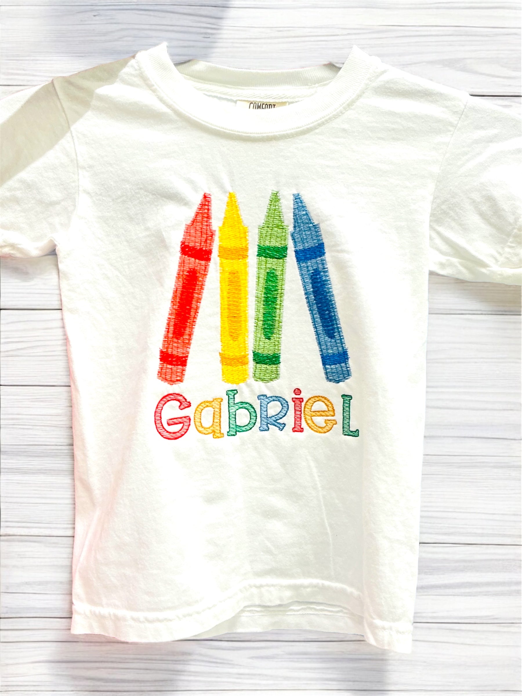 The design is embroidered directly into the shirt. We use high quality 100% ring spun cotton shirts for our embroidery. Our kids shirts are the idea of comfort and style. The material is a thick cotton. This creates a plush, soft and comfy feeling when wearing.