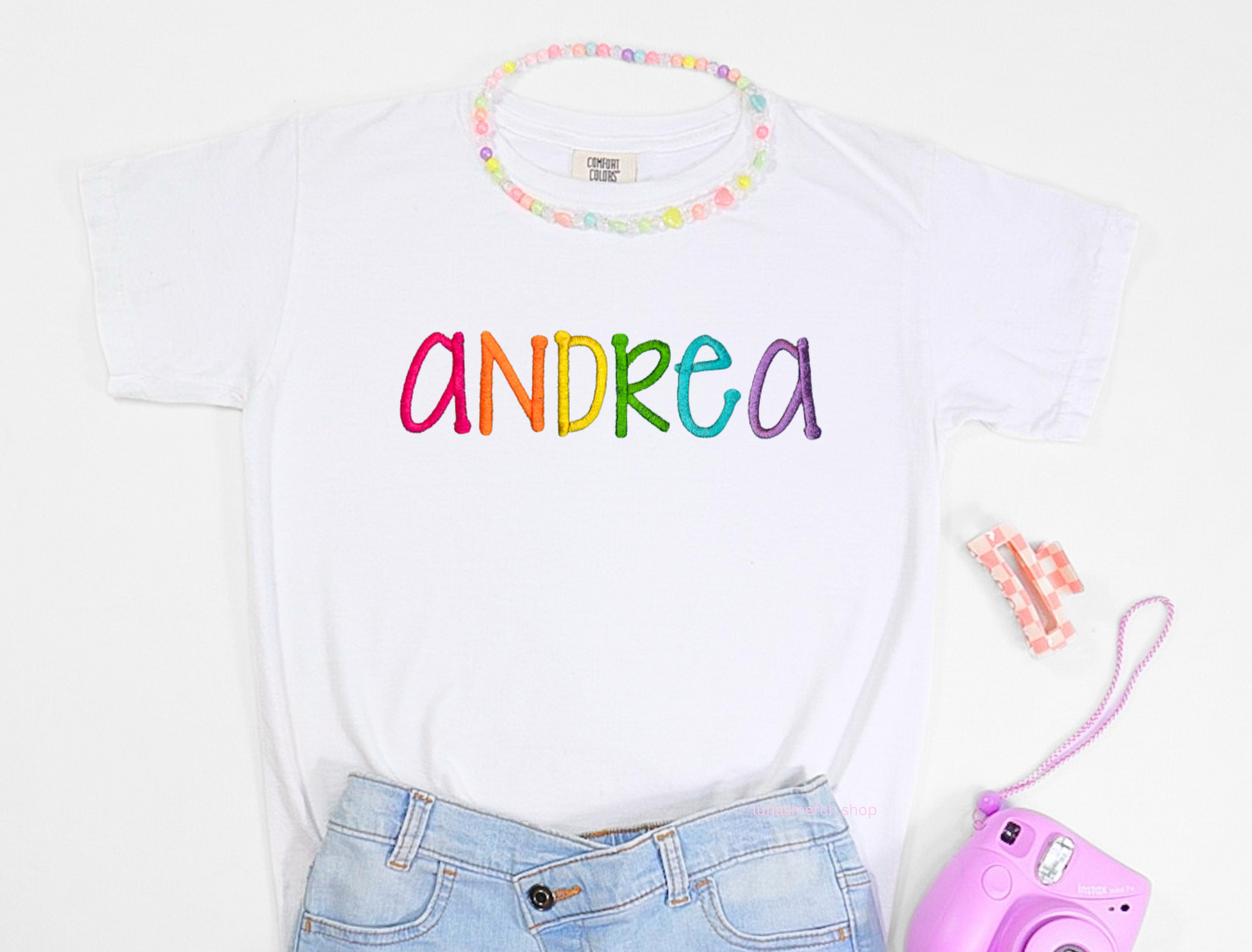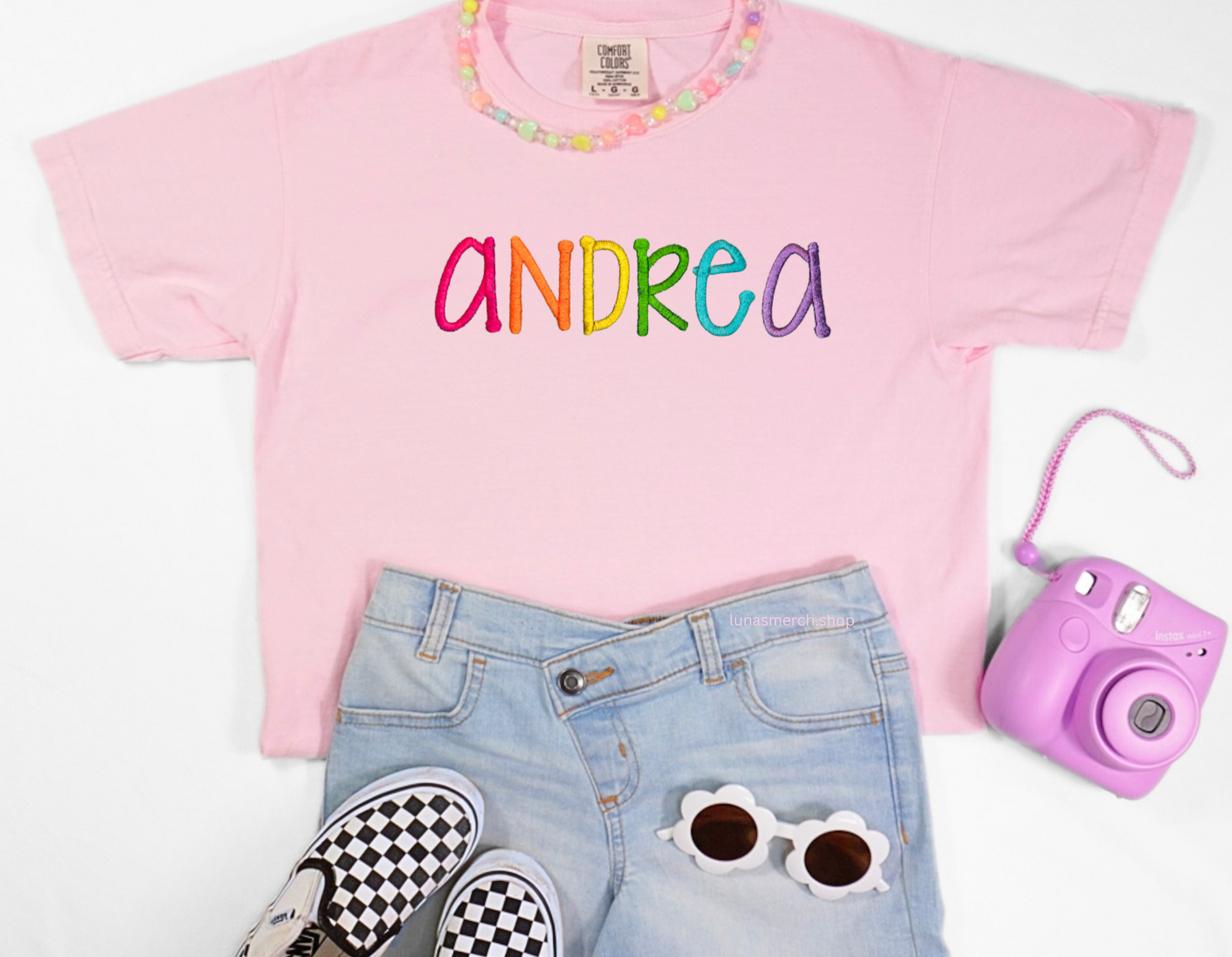 Made with 100% cotton using the popular Comfort Colors brand, this shirt offers a soft, breathable feel and trendy, long-lasting wear your little one will love. Each name is custom embroidered with every letter in a different color—adding a fun, girly touch that makes it truly one-of-a-kind.
